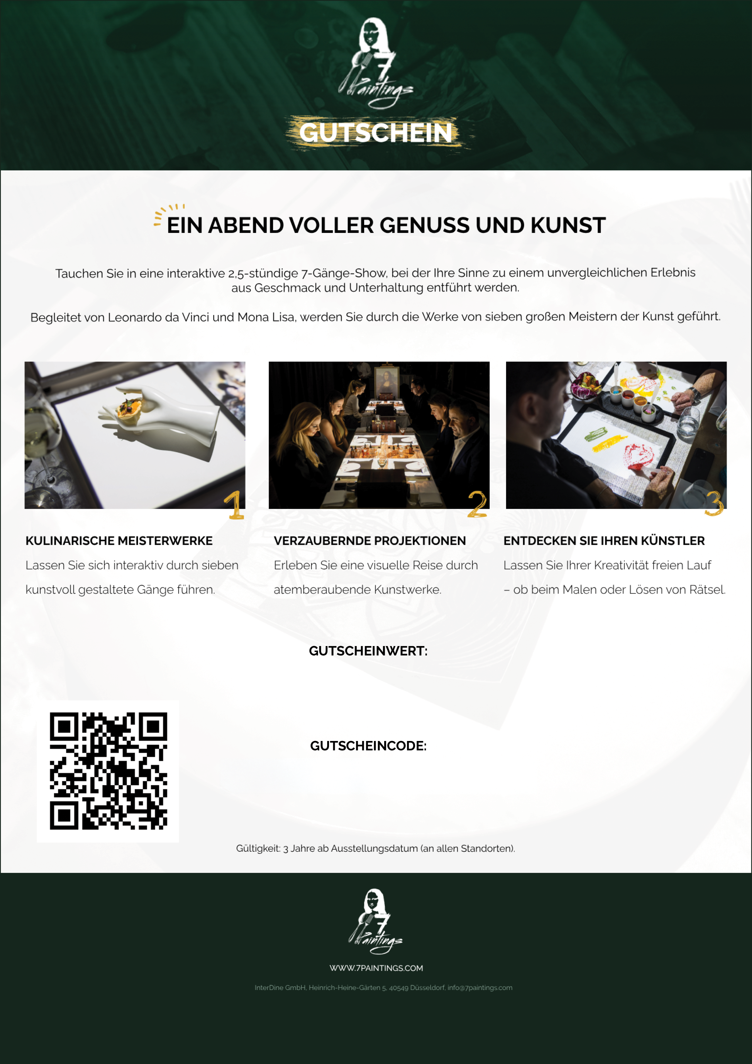 Sie haben das Recht, binnen 14 Tagen ohne Angabe von Gründen den Vertrag über den Kauf der Gutscheine zu widerrufen. Die Widerrufsfrist beträgt 14 Tage ab dem Tag, an dem Sie oder ein von Ihnen benannter Dritter, die Gutscheine oder Waren in Besitz gekauft hat. Um Ihr Widerrufsrecht auszuüben, müssen Sie uns, InterDine GmbH, Heinrich-Heine-Gärten 5, 40549 Düsseldorf, Tel. (069) 34 87 59 67, E-Mail: info@7paintings.com, mittels einer eindeutigen Erklärung (z. B. per E-Mail oder Anruf) über Ihren Entschluss, diesen Vertrag zu widerrufen, informieren.